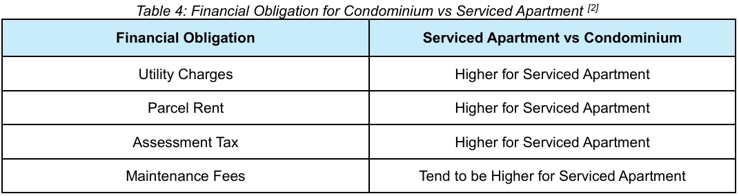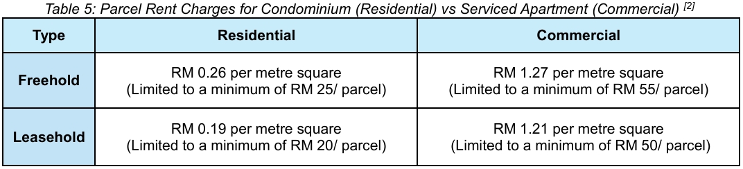 The table showcases the difference of parcel rent charges between condominium (residential) and serviced apartment (commercial):