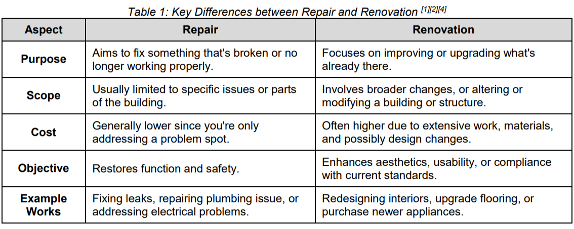 To paint a clear picture of the difference between repair and renovation work, table 1 below summarises various aspects to note the difference between repair work and renovation.