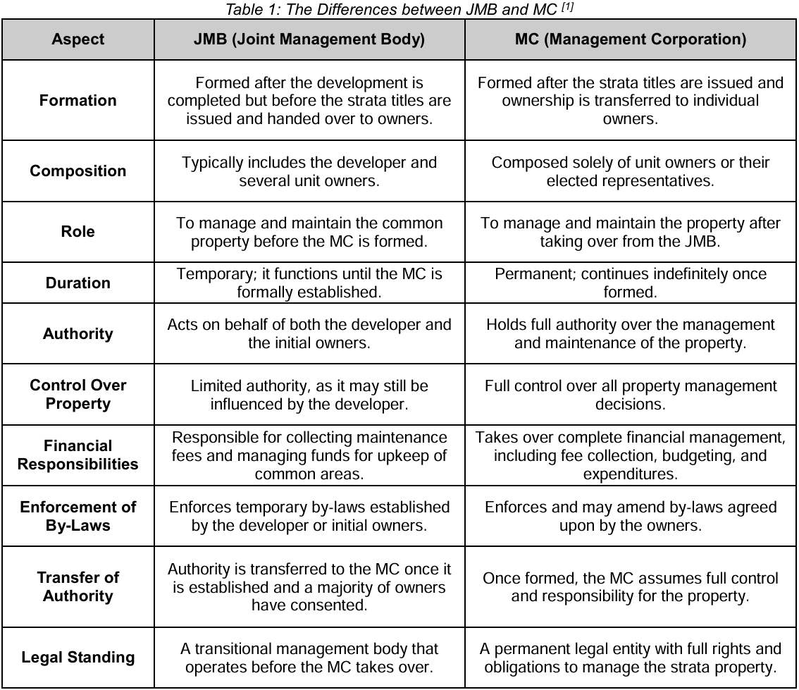 The main distinction between a Joint Management Body (JMB) and a Management Corporation (MC) lies in their timing and authority. The JMB acts as a temporary management body before the strata titles are officially issued by the land office. Once the strata title is granted and the strata register is opened, the MC is formally established to take over full management responsibilities.