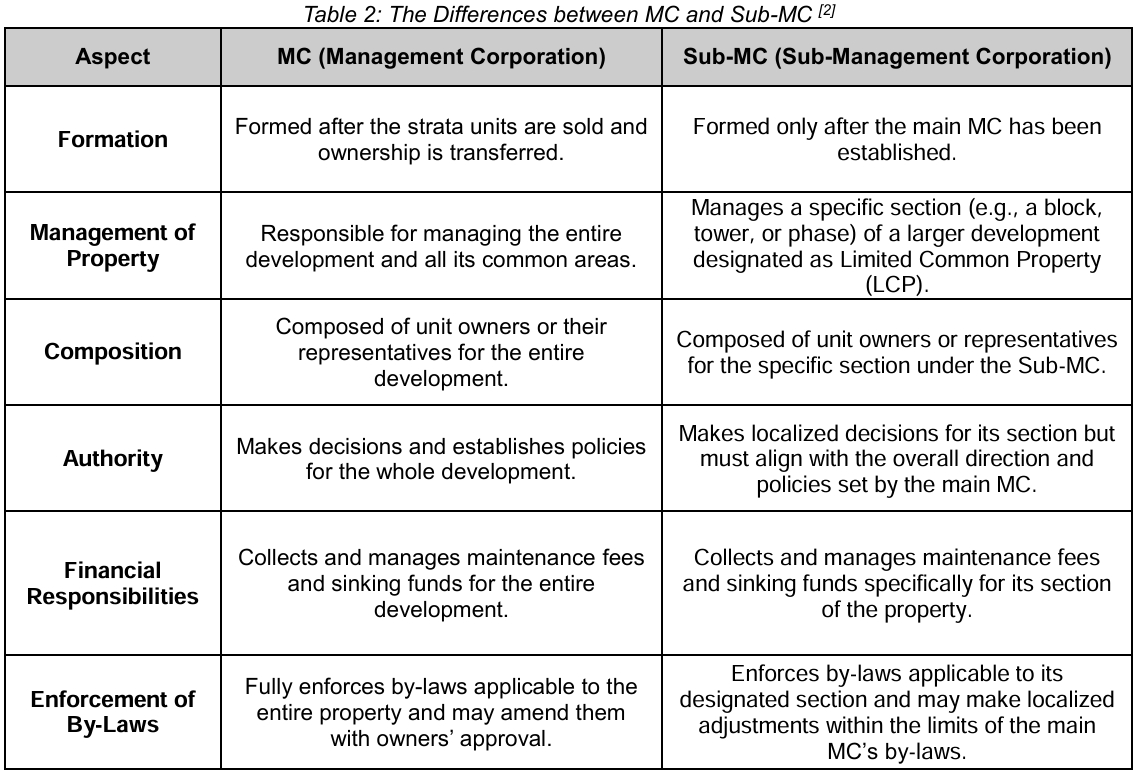 This arrangement is particularly beneficial in mixed-use developments that combine residential, commercial, and retail components, where each section may require separate maintenance or management. A Sub-MC can only be formed after the main MC has been established. While the Sub-MC operates independently in managing its designated areas, it must include at least one representative from the main MC to ensure alignment and coordination between both entities.
