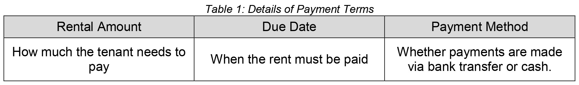 One of the critical aspects of any tenancy agreement is the payment terms, which includes details such as:
