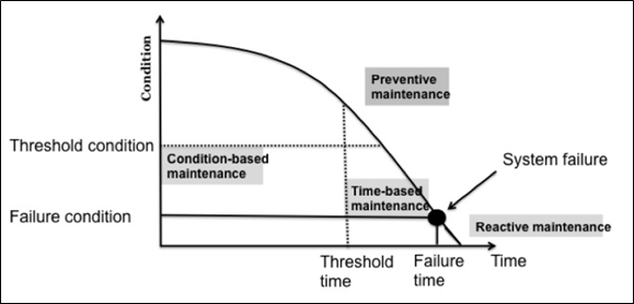Preventive maintenance refers to the regular or scheduled maintenance performed in order to avoid major break down or damage. Preventive maintenance action are often less expensive than reactive maintenance activities. The primary objective of preventive maintenance is to prevent failures in a cost-effective manner [2]. This type of maintenance is conducted before any failure occurs and within acceptable thresholds, as illustrated in Figure 1, in order to prevent significant damage from happening..